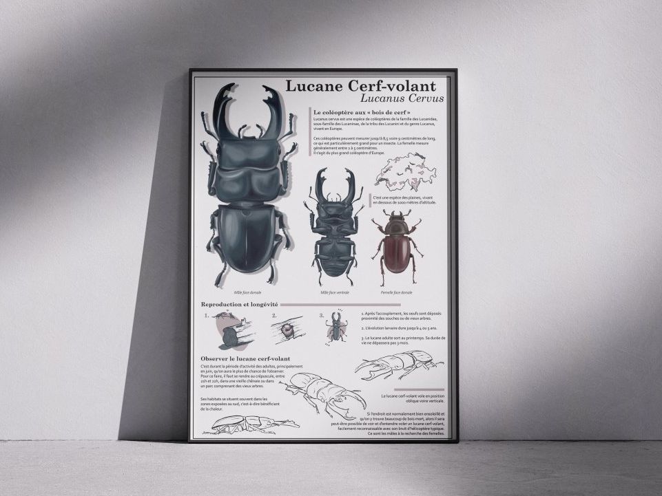 Affiche explicative sur le mode de vie du lucane cerf-volant. Format A3.